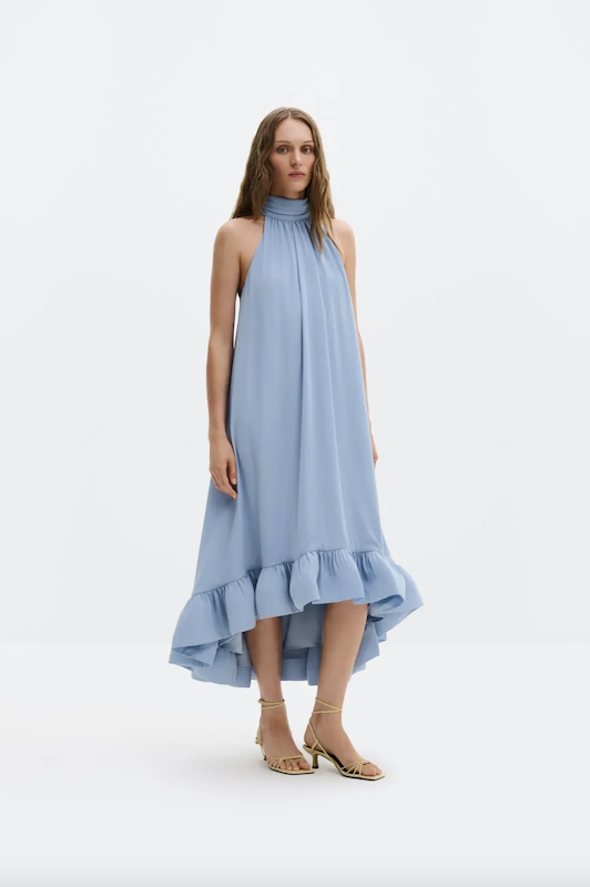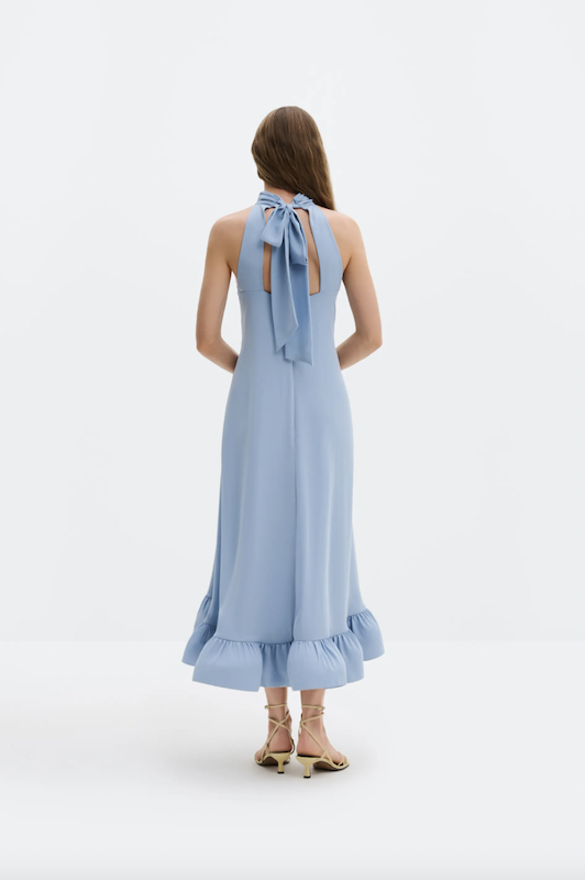 Kaelapaelaga (halterlõikega) maksikleit, mis seotakse selja tagant ja millel on lendlev volangidega alläär.